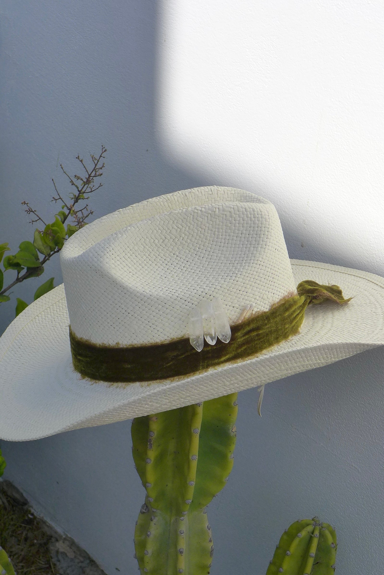 White cowgirl hat with green velvet ribbon, clear quartz crystals, and a match.