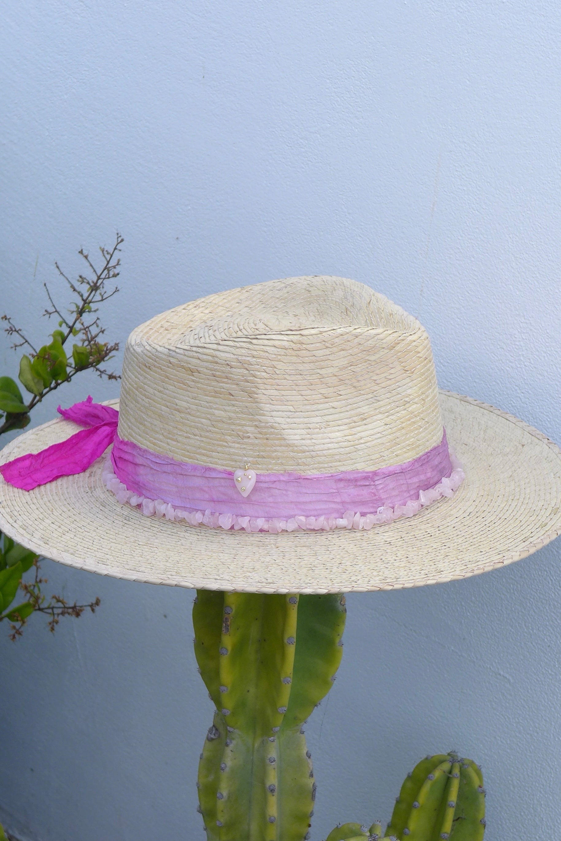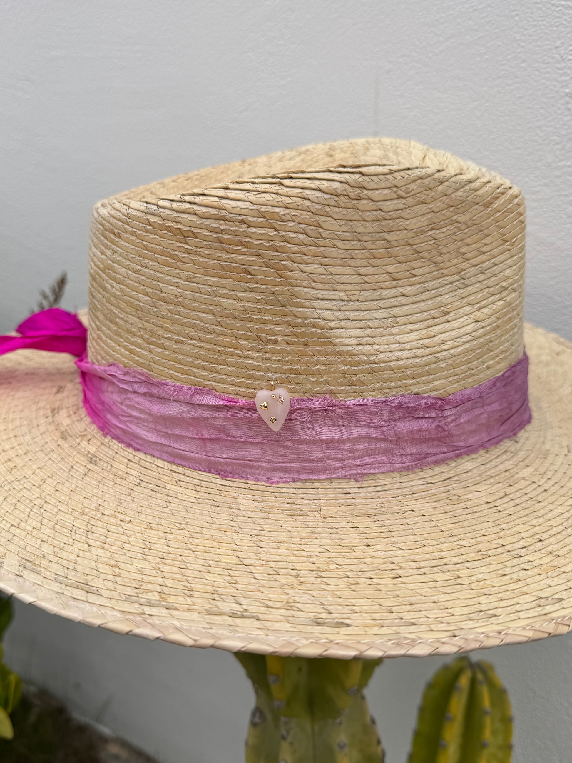 Pink tie-dye ribbon, pink heart stone and soft pink crystals around the brim.