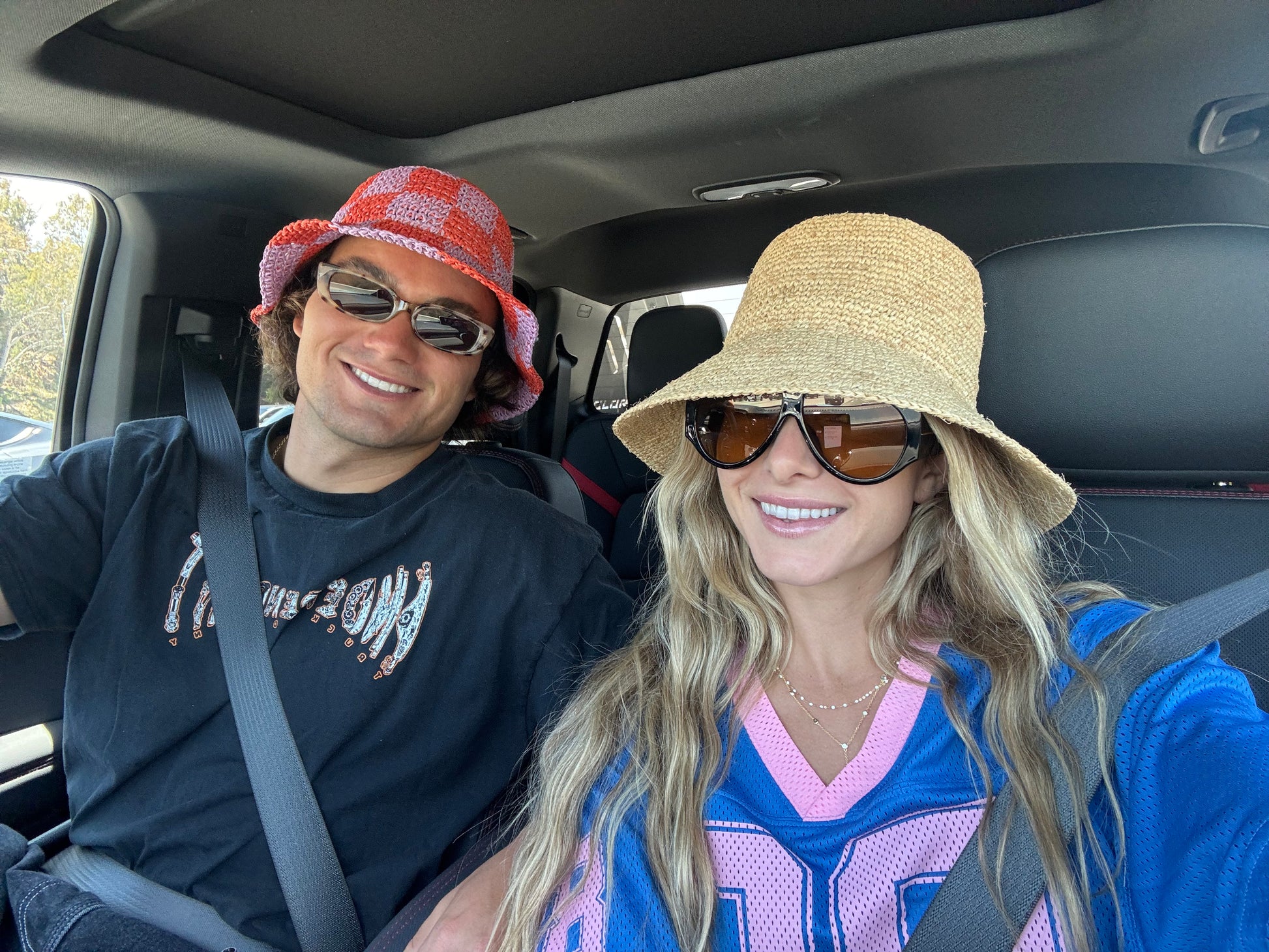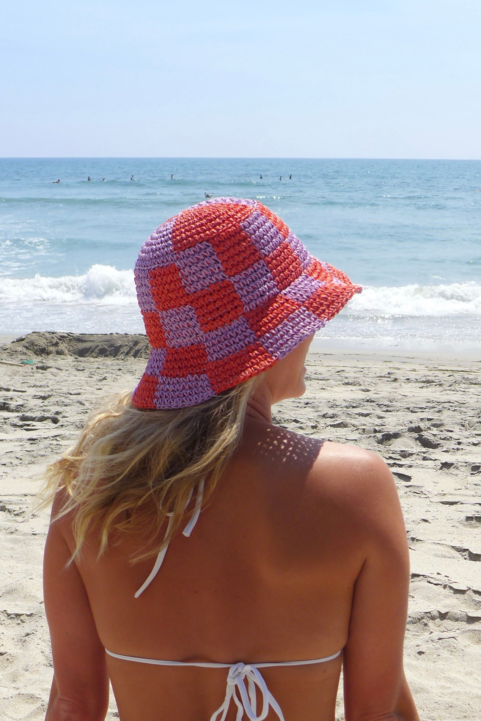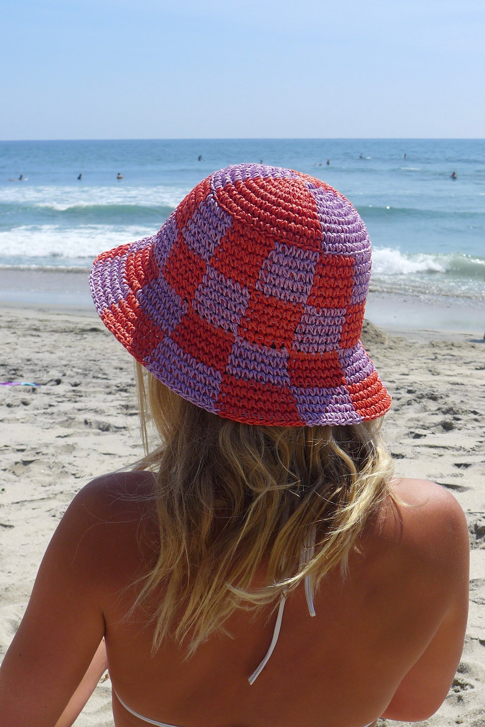 Purple and orange checkered straw bucket hat.